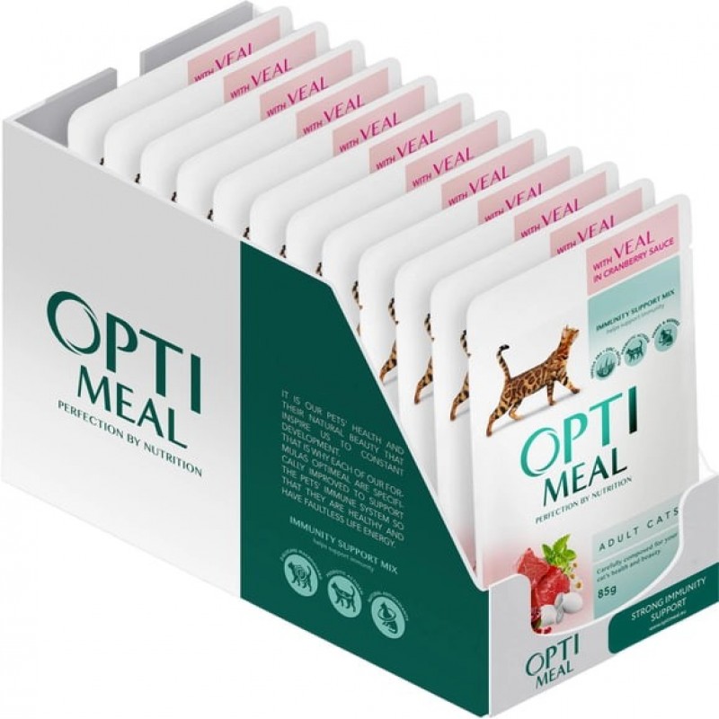 Упаковка повнораціонного консервованого корму Optimeal для дорослих котів з телятиною у журавлиновом 259.0 ₴ |